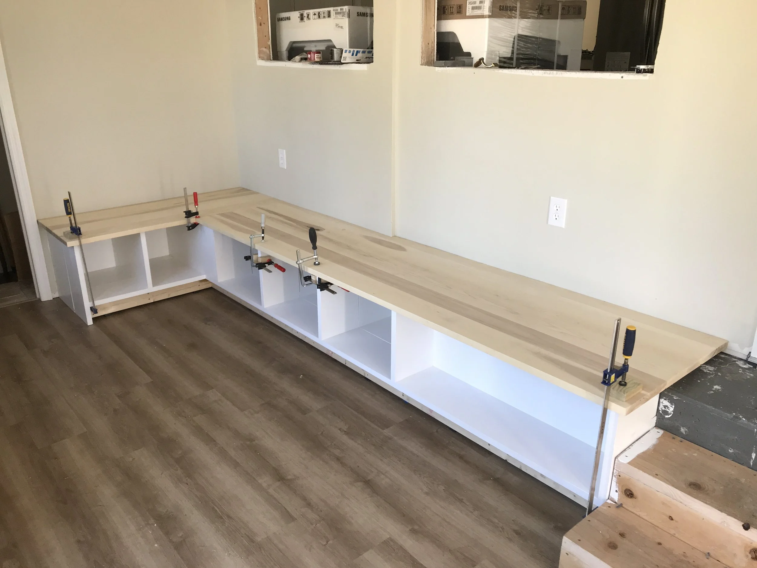 This built-in bench seat was custom built to fit the mud room of this house. The base was built using nickel gap planks, resembling shiplap. The top is built entirely out of solid White Ash.