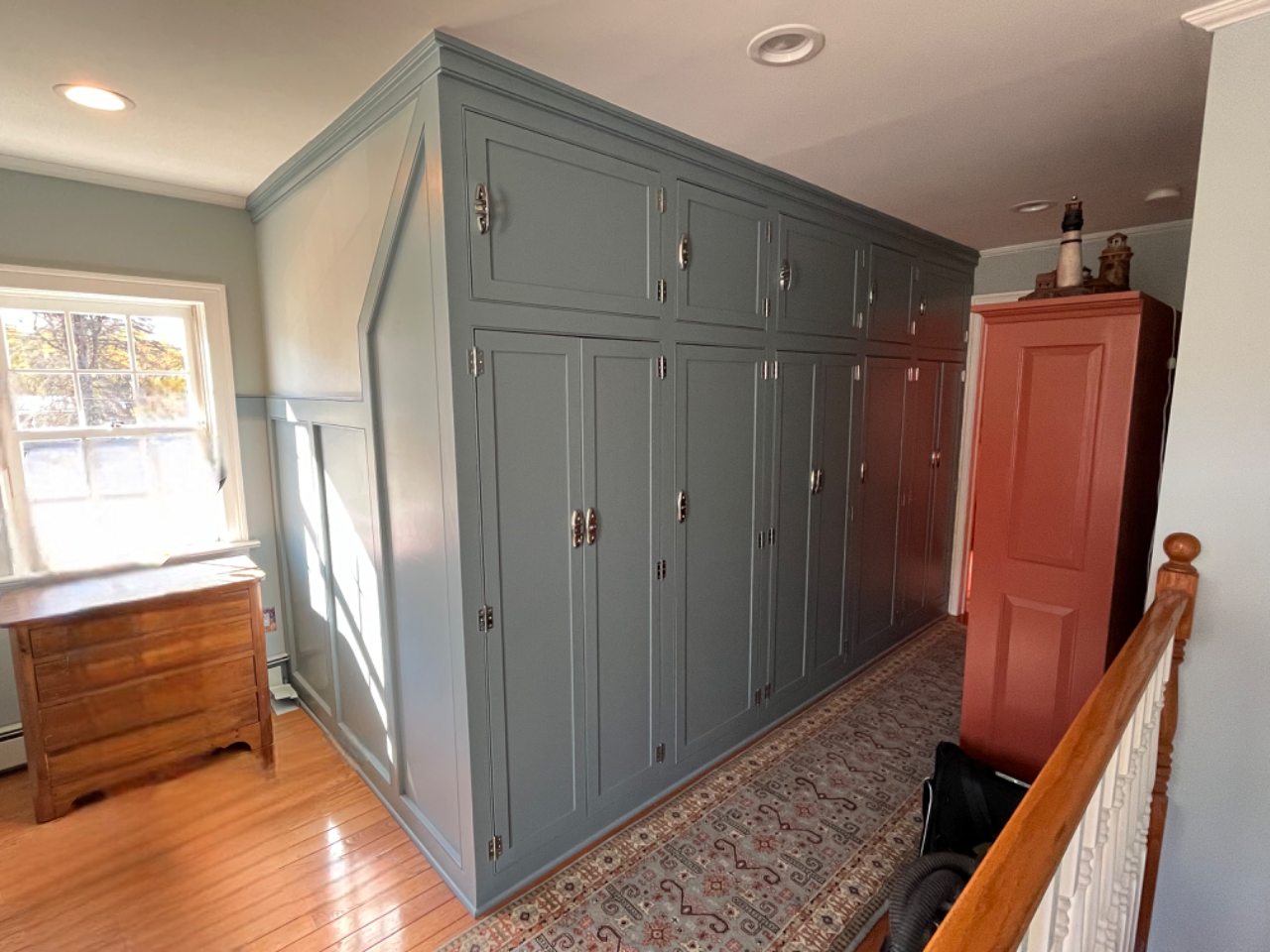 This cabinetry unit was built into the gable roof pitch on the second story of this house. The piece has inset doors, beaded face frame, shaker style doors, and uses chrome nautical themed hardware.