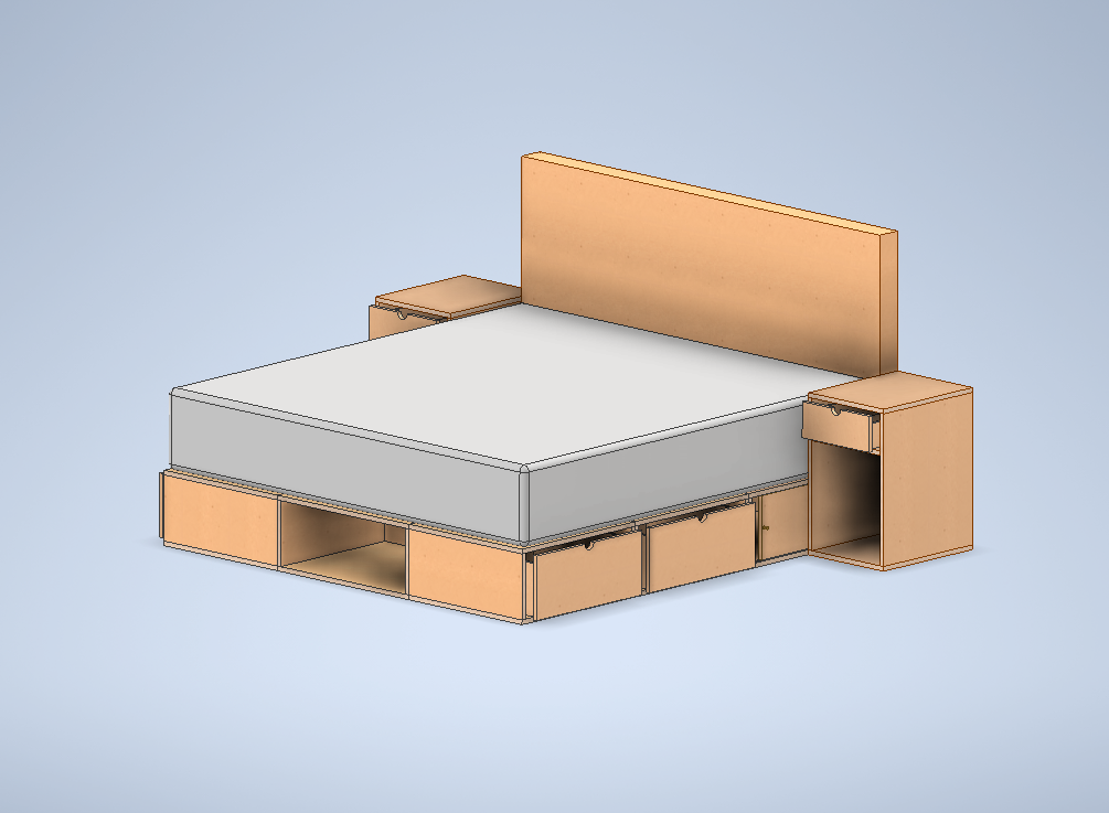 This custom platform bed frame with attached end tables was built for a king sized bed. A combination of solid cherry hardwood, cherry plywood, and Baltic birch plywood were used to construct this project. All drawers are equipped with full extension undermount Blum slides with the soft close feature. Power is integrated into the headboard to allow for easy charging of personal devices. This entire project was first designed using Fusion360, allowing for visualization and accurate material estimates prior to building
